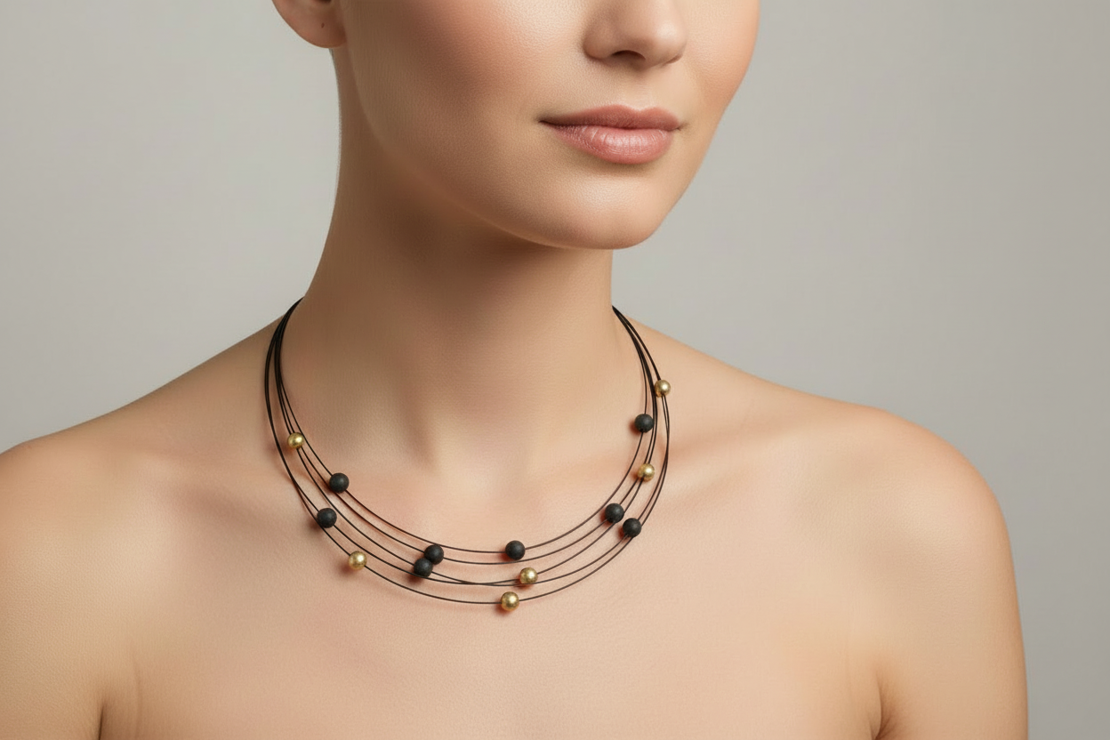 TeNo Black Stainless Steel 5-Strand Nera Necklace with 15 Pearls made from Carbon Fiber and Yellow Gold Aluminum.