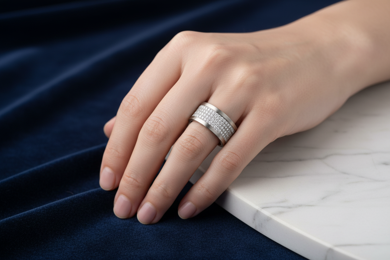 YuMa steel 12mm Pave ring set 5 incredible rows of diamonds going all the way around. Average is 280 diamonds depending on ring size.